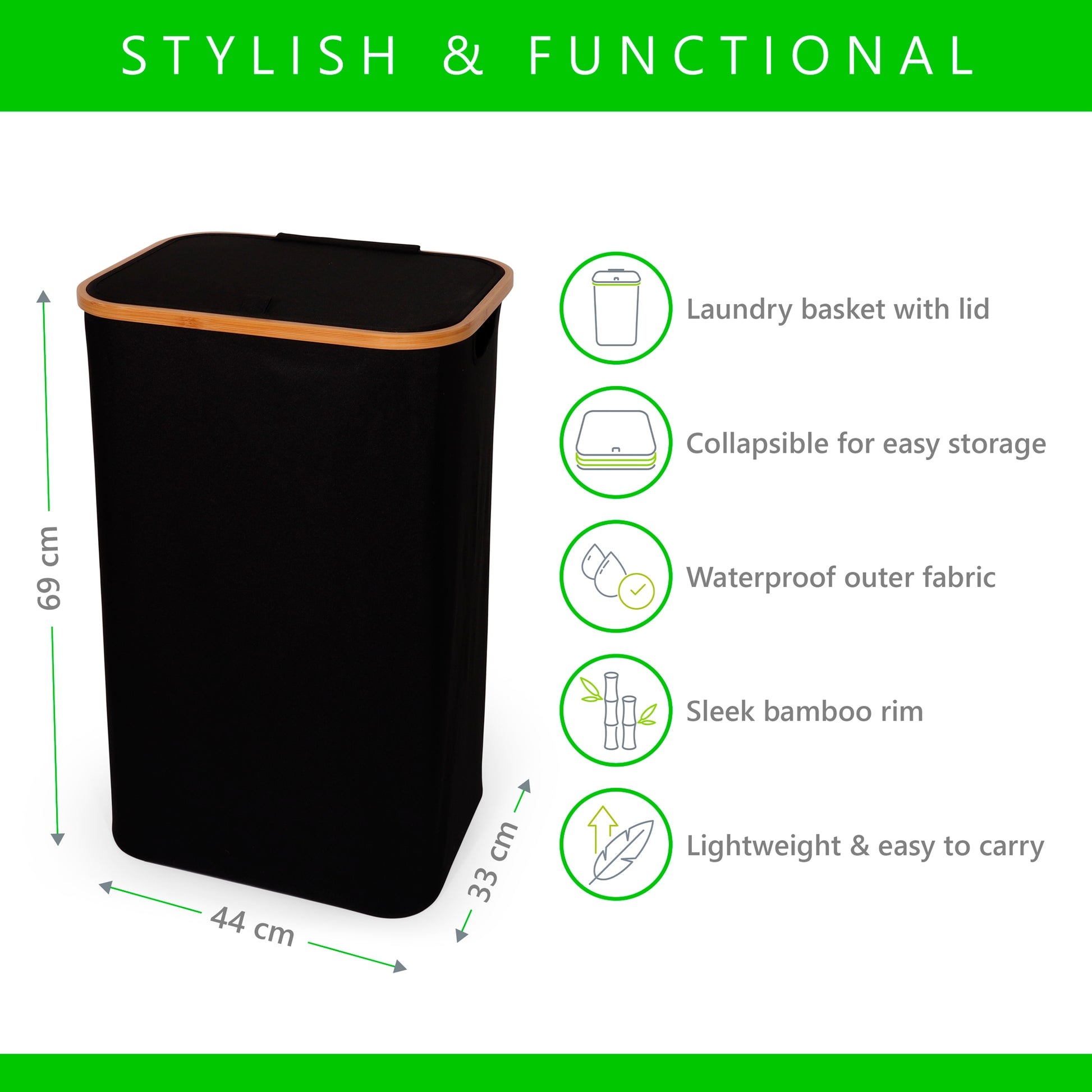 Contemporary Design - with a bamboo rim and fabric body, this washing basket will look good in any room. The solid lid allows dirty washing to be stored discreetly.